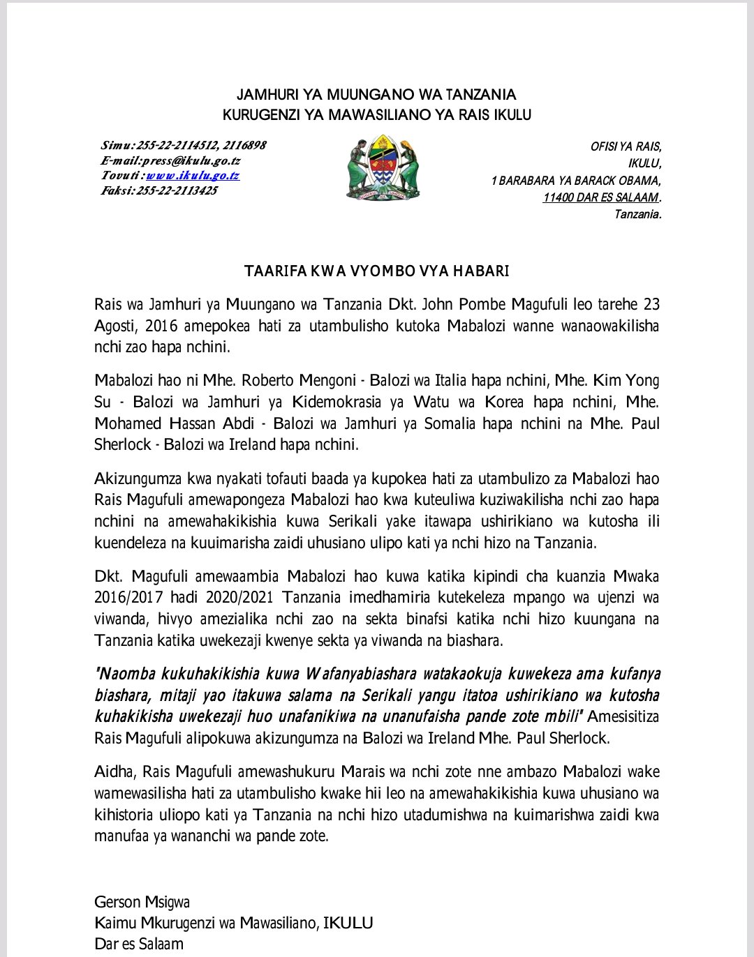 HomeHABARI Rais MagufuliJ Apokea Hati za Utambulisho Kutoka kwa Mabalozi Wanne habayloveHabay all info -August 23, 2016 0 humph the GREAT Tags HABARI Facebook Twitter