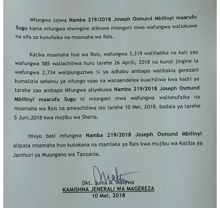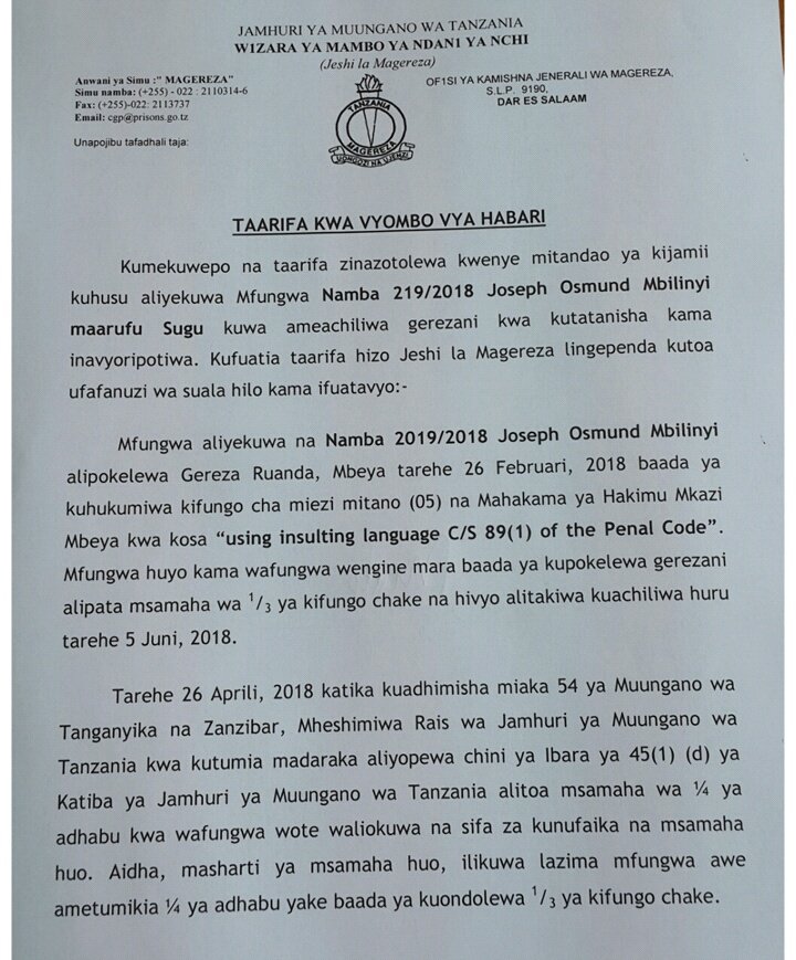 “Mbali na hao, wafungwa wengine 2,734 waliendelea kubaki magerezani akiwemo Sugu na Masonga ili kumalizia sehemu ya kifungo kilichokuwa kimebaki baada ya kupewa msamaha huo na Rais Magufuli,” amesema Mboje.